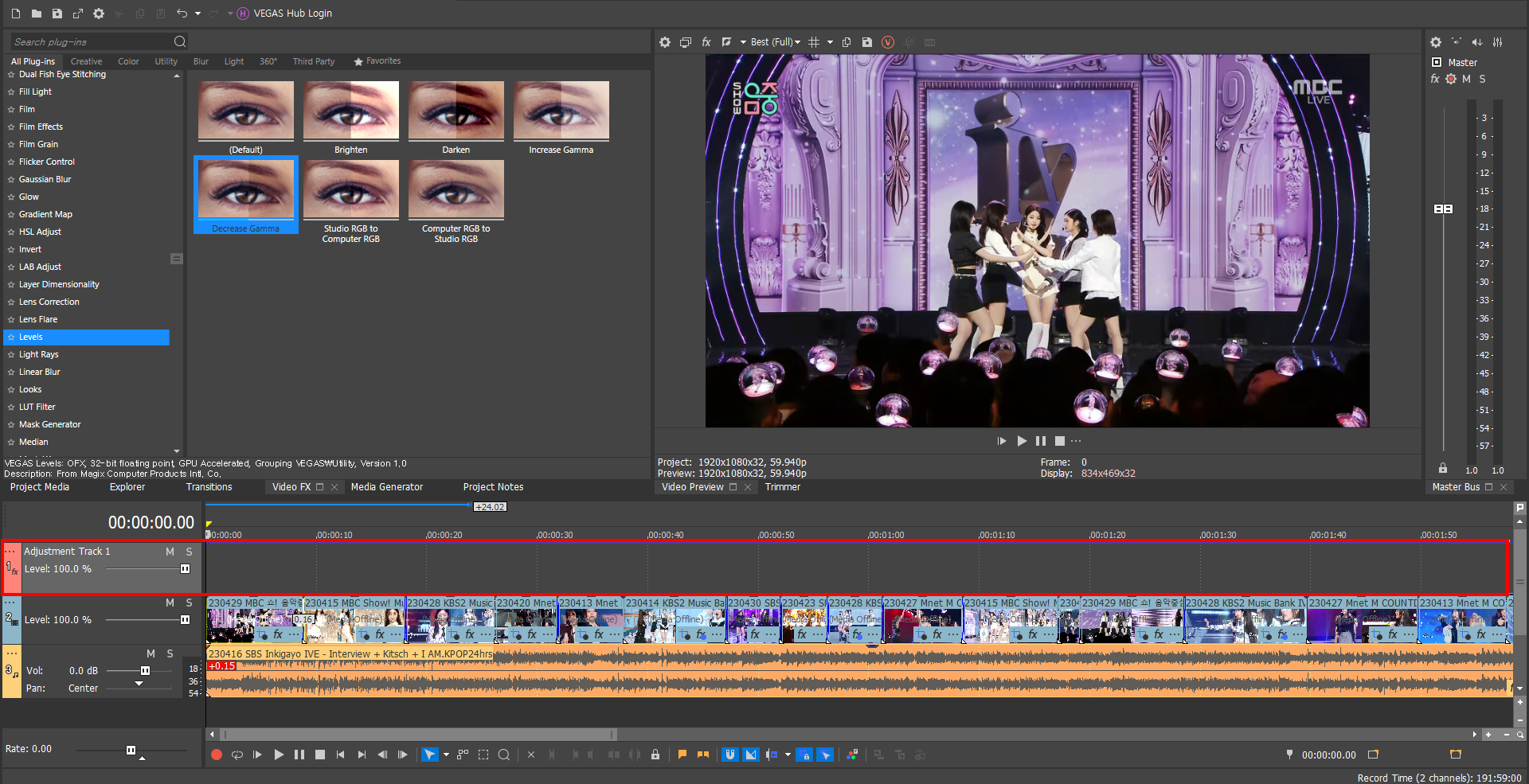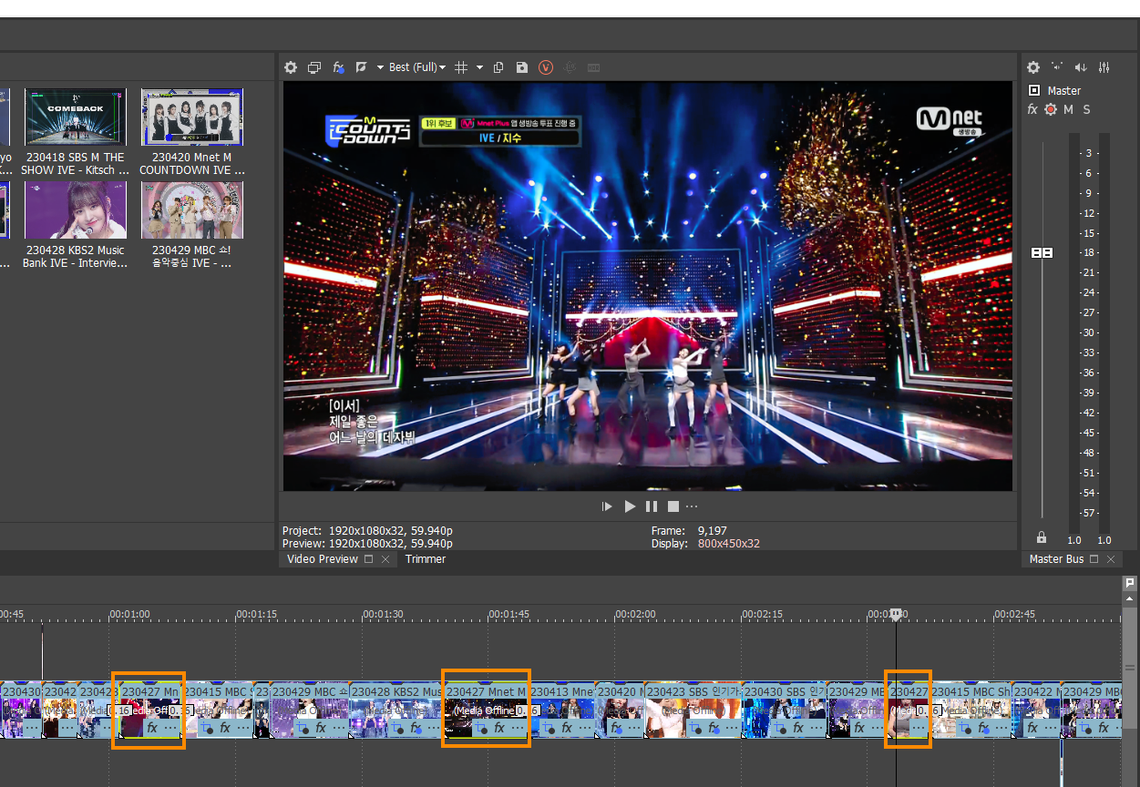 Video FX를 통해서 보정을 넣을 때 특정 영상 소스에만 다른 톤의 보정을 넣고 싶을 때가 있습니다. 제가 네모로 친 부분이 230427 엠카운트다운 영상인데요, 이 영상이 나오는 구간마다 일일이 Video FX를 넣기는 번거롭겠죠?