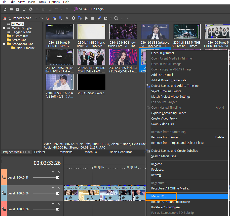 그럴 때는 Project Media 탭에서 원하는 영상 파일에 오른쪽 마우스-Media FX를 눌러서 보정하면 해당 영상 소스가 쓰인 클립에 보정이 일괄적으로 적용됩니다.
