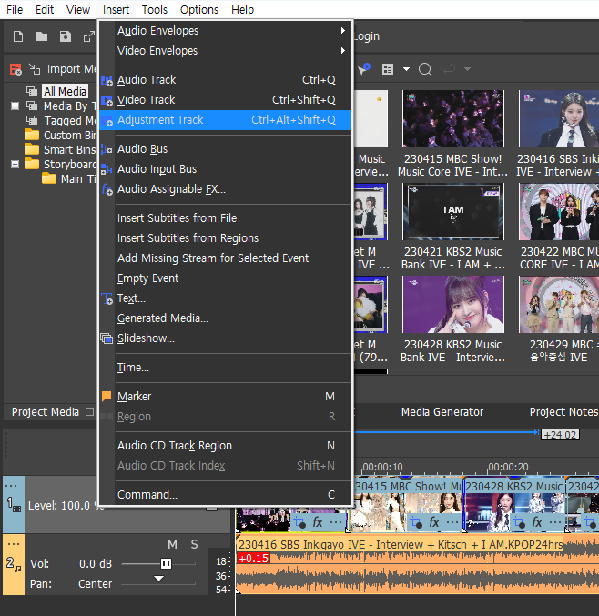 이번에는 조정 트랙 (Adjustment Track)이라는 기능으로 전체 보정을 해볼 건데, 프리미어 프로 사용자분들은 아실 조정 레이어 (Adjustment Layer)와 비슷한 기능입니다. 상단 Insert를 눌러 Adjustment Track을 누르면