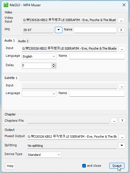 Video에는 비디오 파일을, Audio1에는 오디오 파일을 불러오고 Queue를 누르면