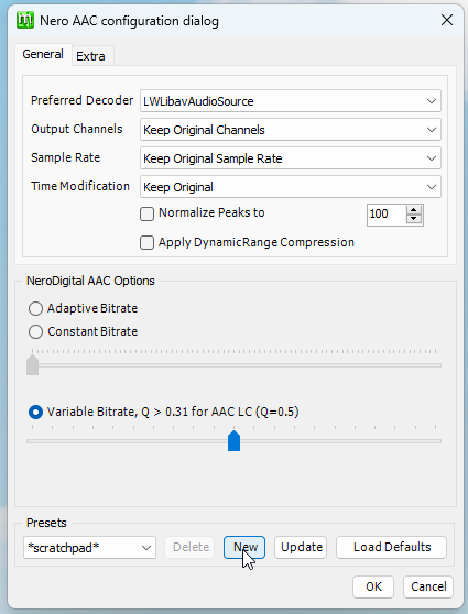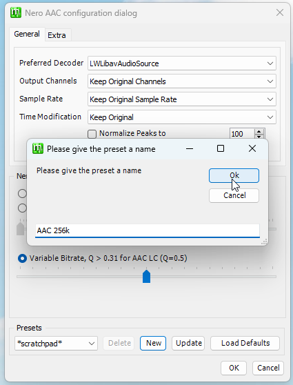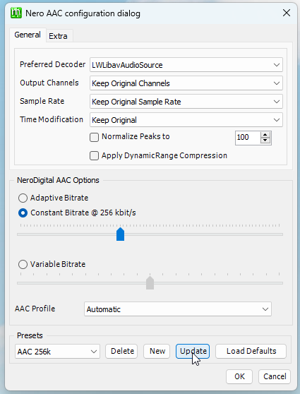 세팅은 위와 같이 해주세요. AAC 코덱의 경우 비트레이트가 256kbps 이상이면 차이가 안 난다고 봐도 된다고 하더라고요. 세팅 후 Update를 눌러 프리셋을 업데이트해주고 OK를 눌러 나가줍니다.