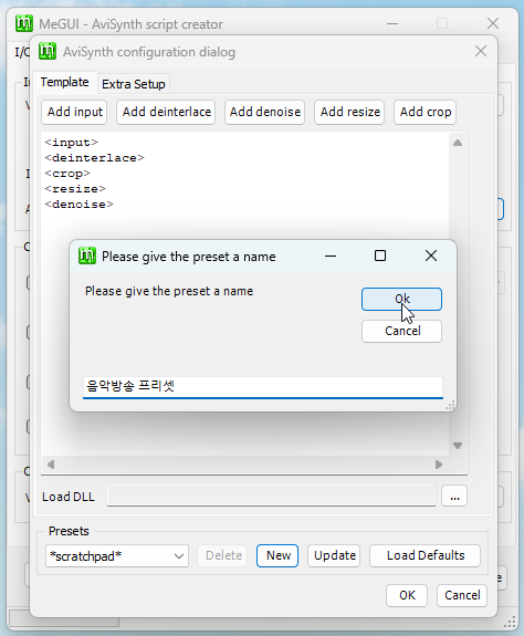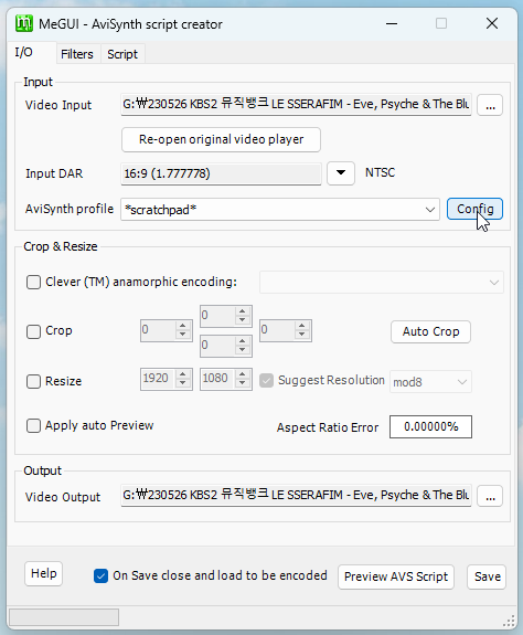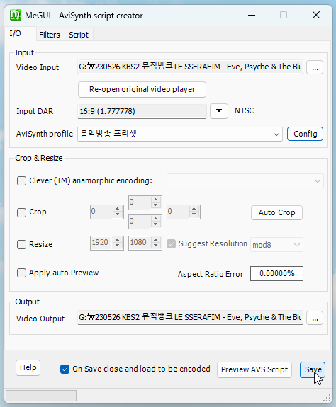 Save를 눌러 avs 스크립트 파일을 생성해 줍니다.