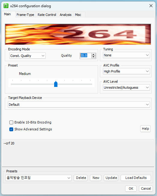 Rate Control탭으로 이동해줍니다. VBV Vuffer Size와 VBV Maximum Bitrate에 20000을 적어줍니다. 최대 비트레이트를 20000kbps로 제한한다는 의미입니다. 음악방송의 경우 20000kbps이면 괜찮더라고요. 그리고 밑에 Update를 눌러 프리셋 설정 값을 업데이트하고 OK를 눌러 나가줍니다.