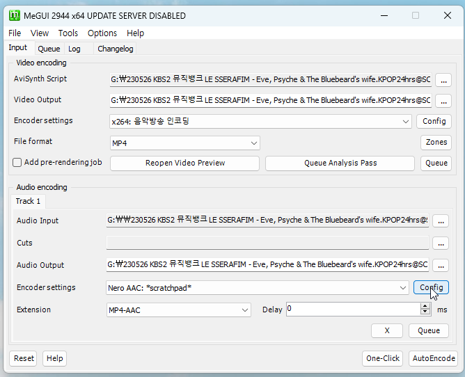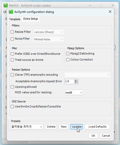 스크립트를 작성해줍니다. 저는 이 글에서 설명했던 QTGMC 필터 스크립트를 작성했습니다.