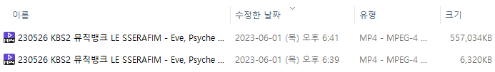 인코딩이 모두 완료되면 파일이 두 개 생깁니다. 크기가 큰 파일은 비디오, 작은 파일은 오디오 파일입니다. 이 두 개를 합쳐줘야 완전한 영상이 되는데요,
