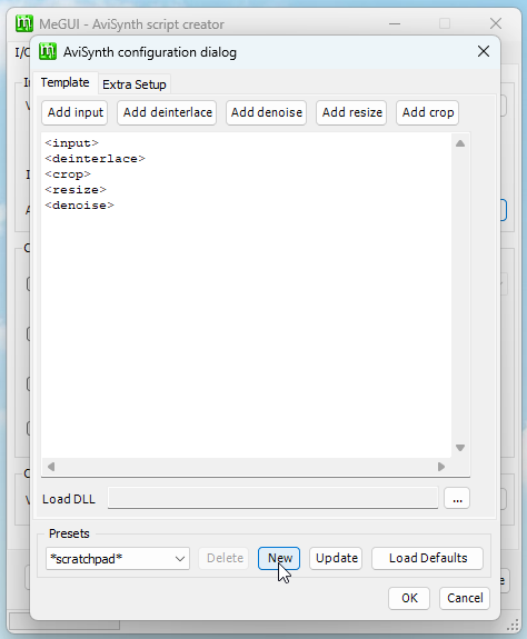 그러면 스크립트 작성 창이 하나 떠있을 겁니다. AviSynth 프로파일을 만들어주기 위해 Config을 눌러줍니다.