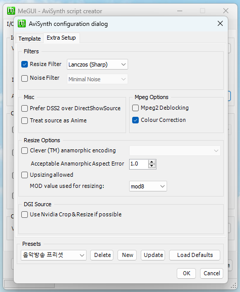 Extra Setup 탭으로 가서 Resize Filter와 Colour Correction을 체크 해제 해줍니다.