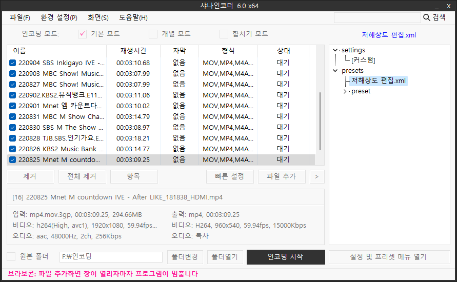 샤나인코더를 열고 프리셋 적용 후 편집할 영상들을 모두 인코딩해줍니다.
