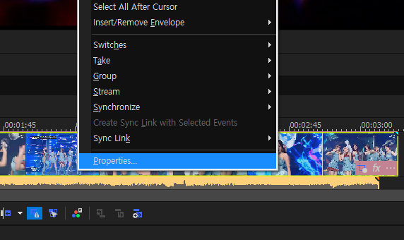 이제 베가스에서 영상을 불러온 다음 영상 클립에 오른쪽 마우스 클릭 후 Properties를 눌러주세요.