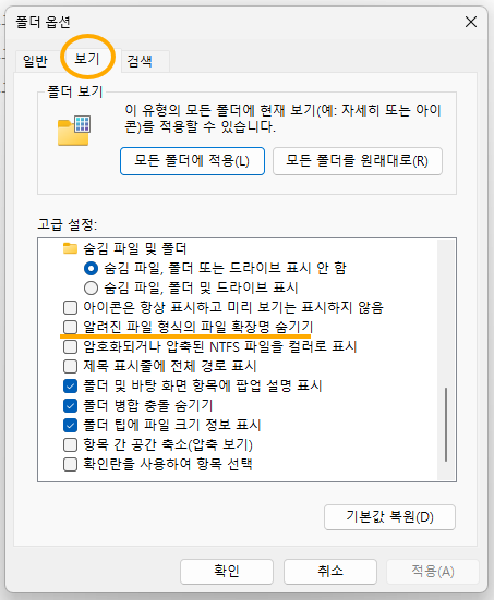 보기-알려진 파일 형식의 파일 확장명 숨기기를 체크 해제해주세요.