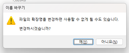 그러면 확장명 변경 경고 창이 뜨는데 예를 눌러주면 됩니다.