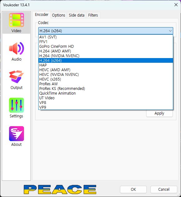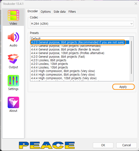 Codec은 H264, Presets는 위와 같이 선택 후 Apply를 눌러 적용해 줍니다.