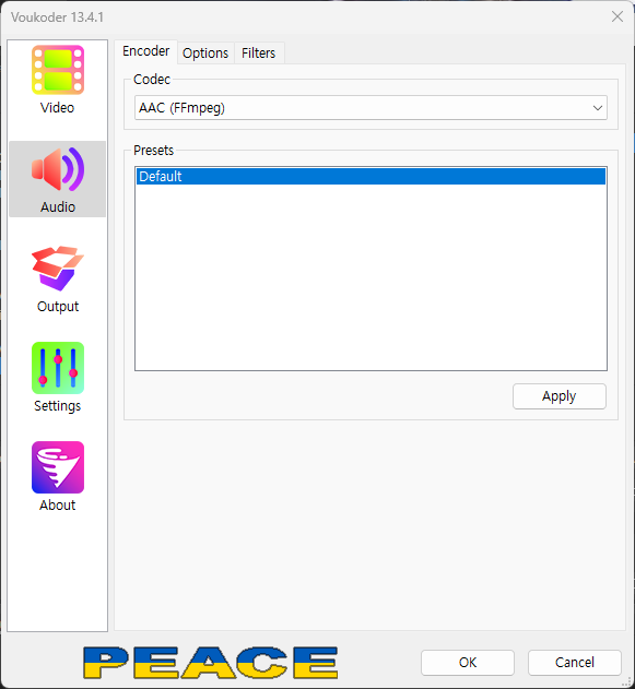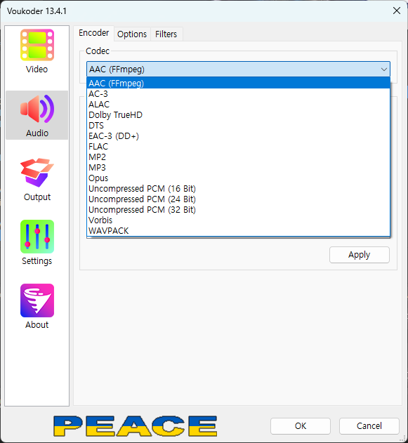Audio탭으로 이동해 줍니다. 오디오 코덱도 굉장히 다양하게 지원합니다. 일반적으로 AAC가 많이 쓰입니다.