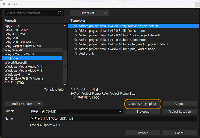 설치 후 베가스 렌더링 옵션에 가보면 Voukoder가 추가되어 있을 겁니다. 옵션이 여러 가진데 대중적인 세팅은 맨 위에 있는 것을 골라주시면 됩니다. 참고로 영상의 해상도와 프레임은 베가스의 프로젝트 세팅 상태을 따라갑니다. 렌더링 옵션에서 따로 조절은 불가능합니다.
