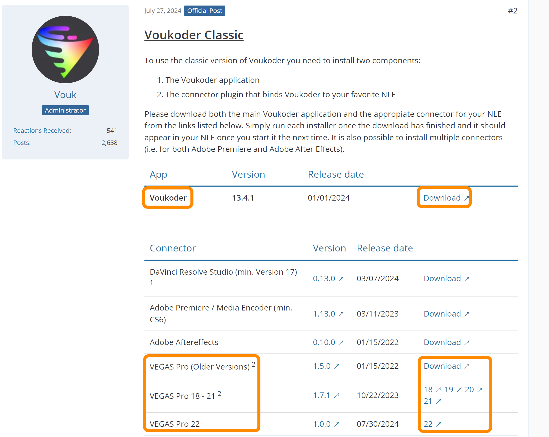 설치는 매우 간단합니다. 사이트에 접속 후 Coukoder Classic에서 Voukoder부터 설치합니다. 그리고 Connector에서 자신의 베가스 버전에 맞는 걸 설치하시면 됩니다.