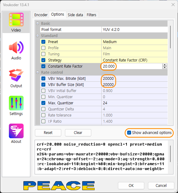 Show advanced options를 체크하면 추가 옵션도 볼 수 있습니다. 여기서 VBV 옵션을 건드려줄건데, 최대 비트레이트를 지정하는 옵션입니다. 1920x1080 60fps 영상 기준 20000 정도를 추천드립니다. 두 칸 모두 동일한 값을 넣어주면 됩니다.