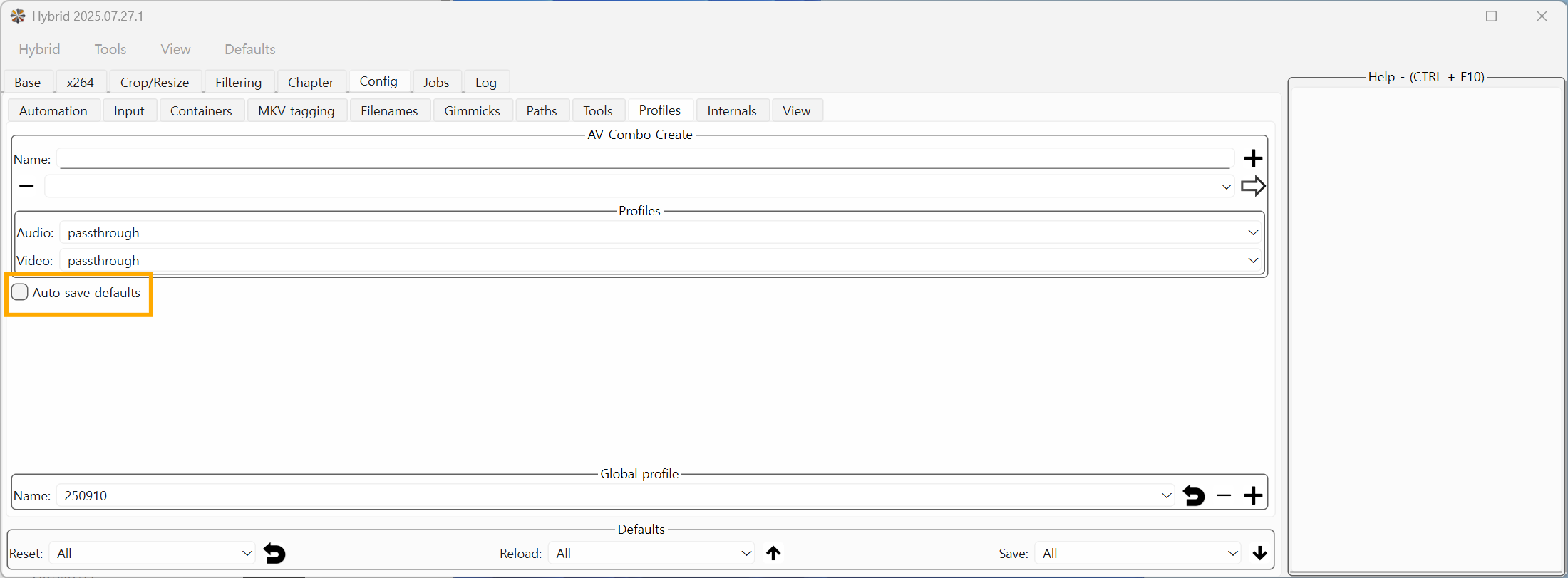 가장 먼저 Config-Profiles에서 Auto save defaults에 체크해 줍니다. Hybrid 인코더는 프로그램을 껐다 켜면 설정 값이 초기화되는 특성이 있습니다. 이걸 방지하기 위해 체크를 해주는 겁니다.