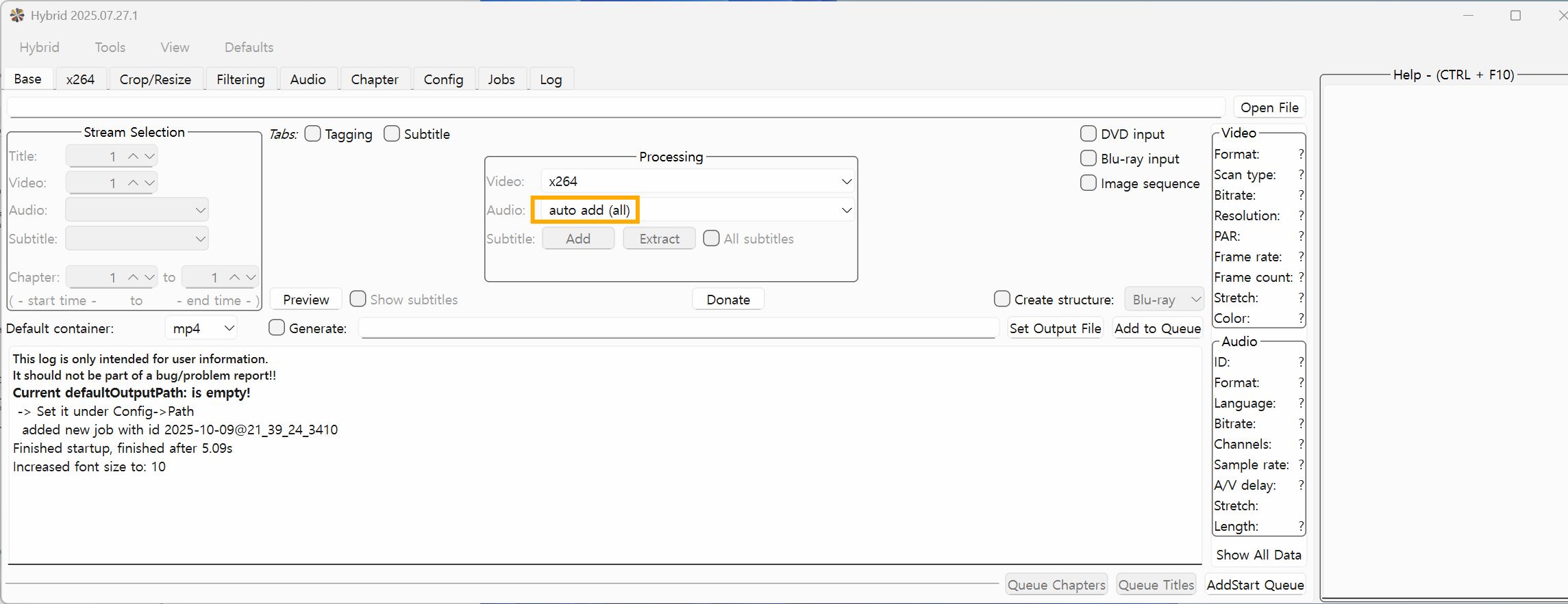 Base탭에서 Audio는 auto add (all)로 변경해 줍니다. 기본적으로 ignore(무시)로 되어있는데 이러면 오디오가 출력되지 않습니다.
