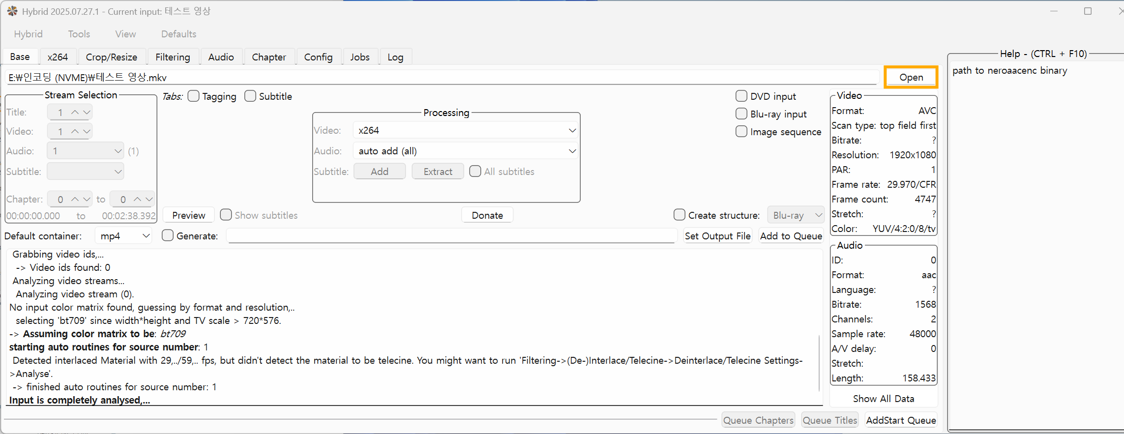 본격적으로 인코딩을 하기 위해 Base 탭에서 Open을 눌러 인코딩할 영상을 불러옵니다.