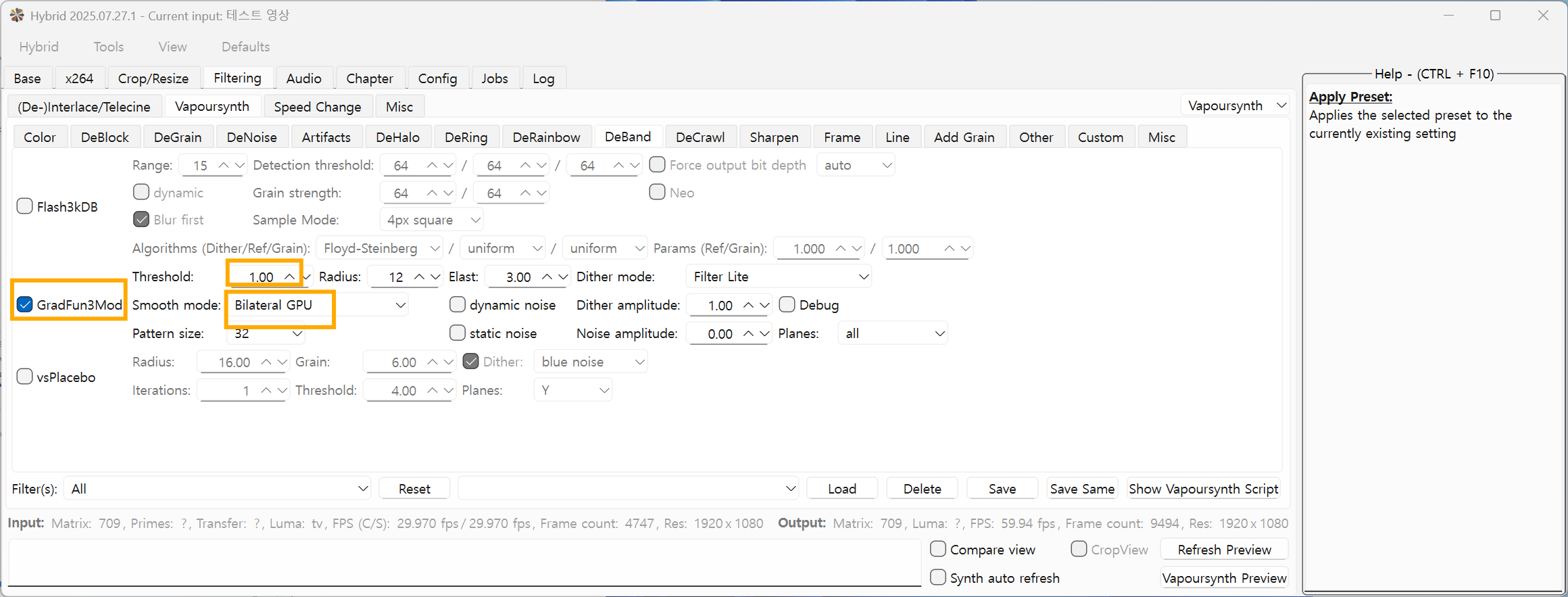 Gradfun 필터를 적용하기 위해 Filtering-Vapoursynth-DeBand 탭으로 이동해 줍니다. GradFun3Mod에 체크해 줍니다. Smooth mode는 Bilateral GPU를 선택해 줍니다. 저 같은 경우 Gradfun2db를 쓸 때는 Threshold 값을 2.5를 줬었는데요, GradFun3Mod에선 1로 주면 비슷하게 보이는 것 같습니다.