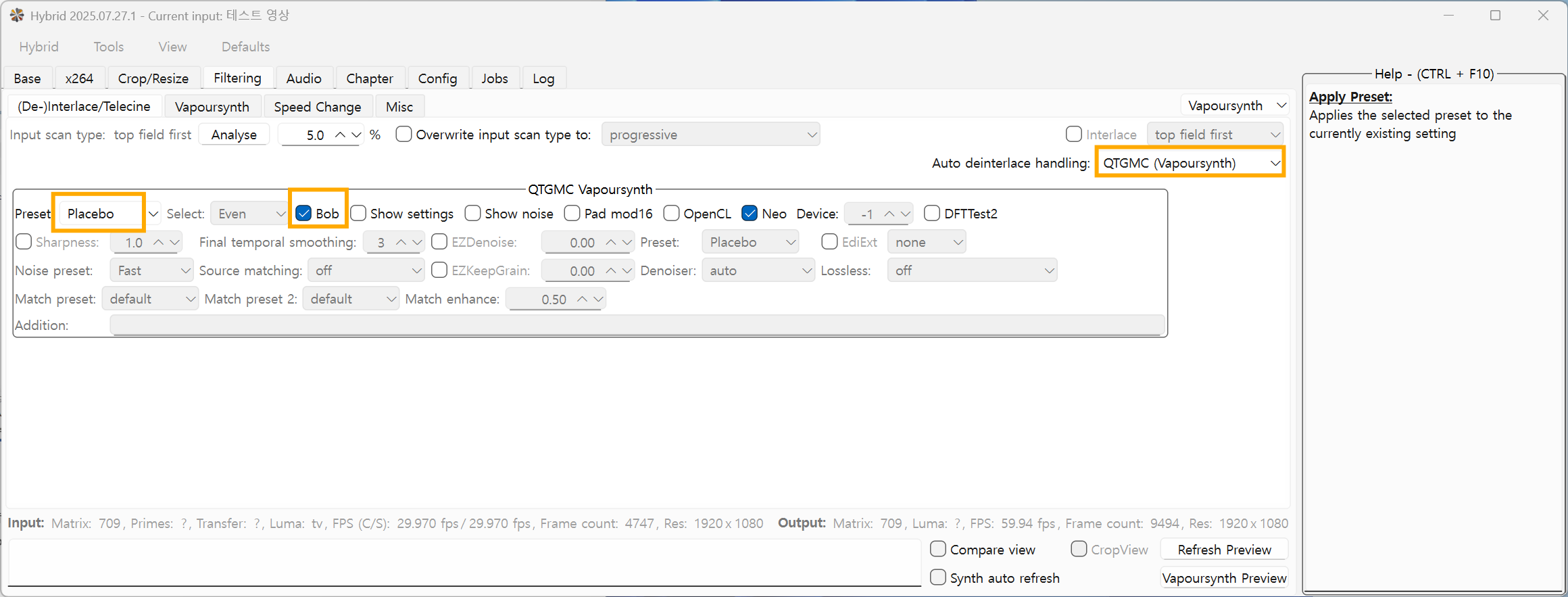 (De-)Interlace 탭을 보면 기본적으로 QTGMC(Vapoursynth) 필터가 적용이 되어 있습니다. QTGMC(Avisynth)보다 좀 더 진보된 방식인데요, 차이점은 아래의 챗 GPT 답변을 참고하시고, Preset은 화질이 가장 좋은 Placebo로 선택해 주었습니다. 60프레임으로 디인터레이스 하려면 Bob도 체크해 주세요.