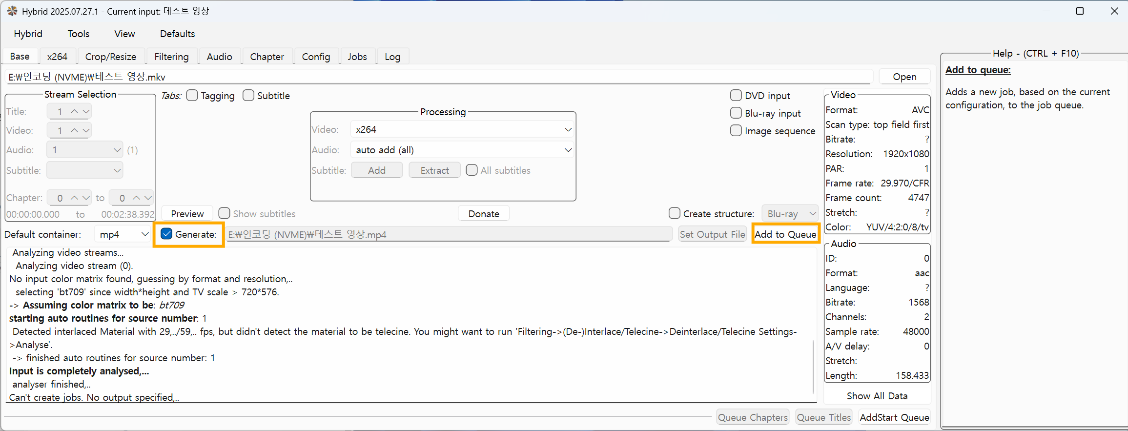 Jobs-Queue탭에 가면 작업이 추가되어 있을 겁니다. Start를 누르면 인코딩이 시작됩니다.