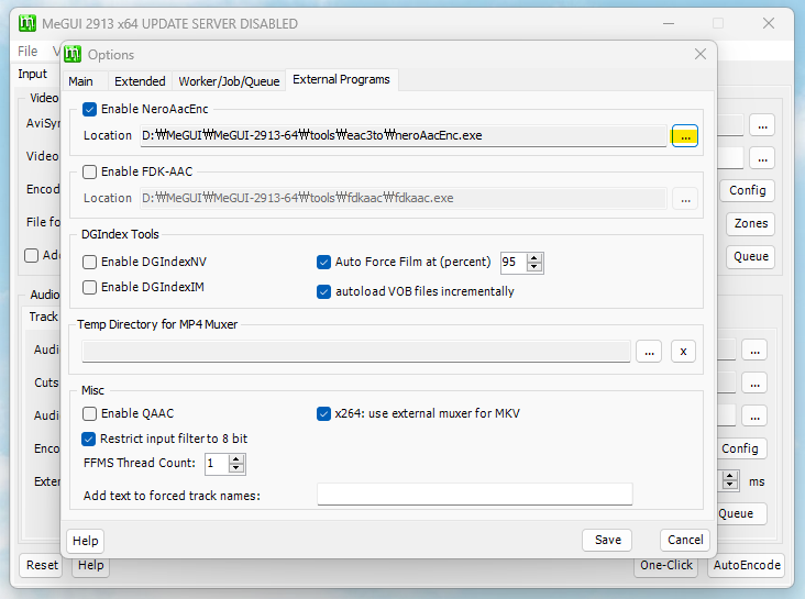 메구이 실행 후 Option>External Programs>Enable NeroAacEnc에 체크 후 아까 받은 neroAacEnc.exe 파일을 불러옵니다. Save를 눌러 저장 후 메구이를 다시 실행하면 기본적인 설치는 끝납니다.