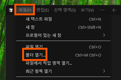 먼저 작업할 폴더를 지정해 줍니다. 파일-폴더 열기를 눌러주세요.
