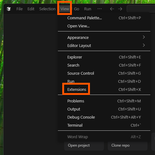이 부분은 생략하셔도 되는데 프로그램 메뉴 언어가 영어라서 한글 언어팩을 설치해 주겠습니다. 상단 View에서 Extensions를 눌러줍니다.